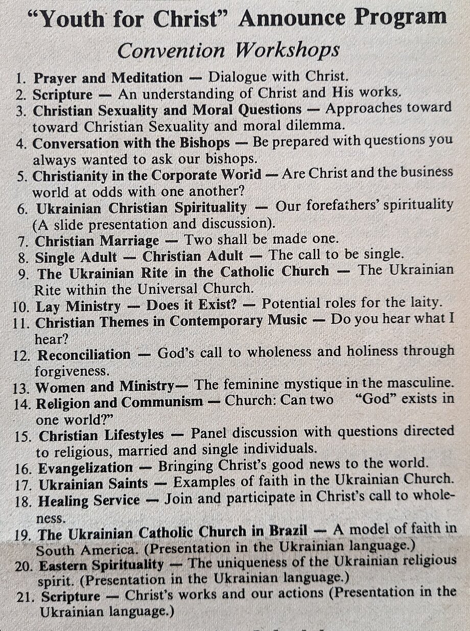 The 6th All-American Youth Pilgrimage took place the weekend following June 12 in Parma, Ohio. The tradition of such pilgrimages for young people is not new to our Church in America. On this occasion, we would like to recall the Ukrainian Youth of Christ Convention, which was held in Parma, Ohio, in 1986.