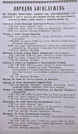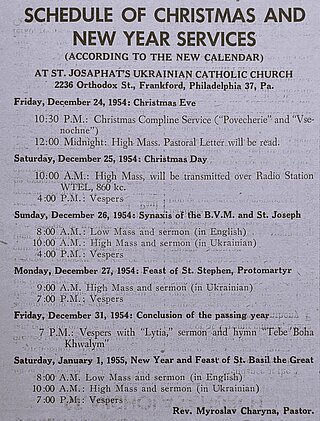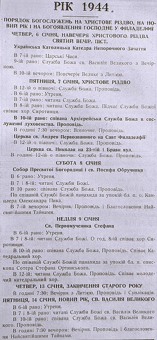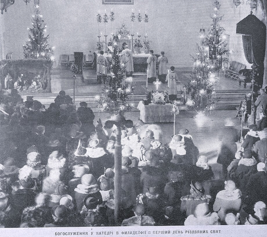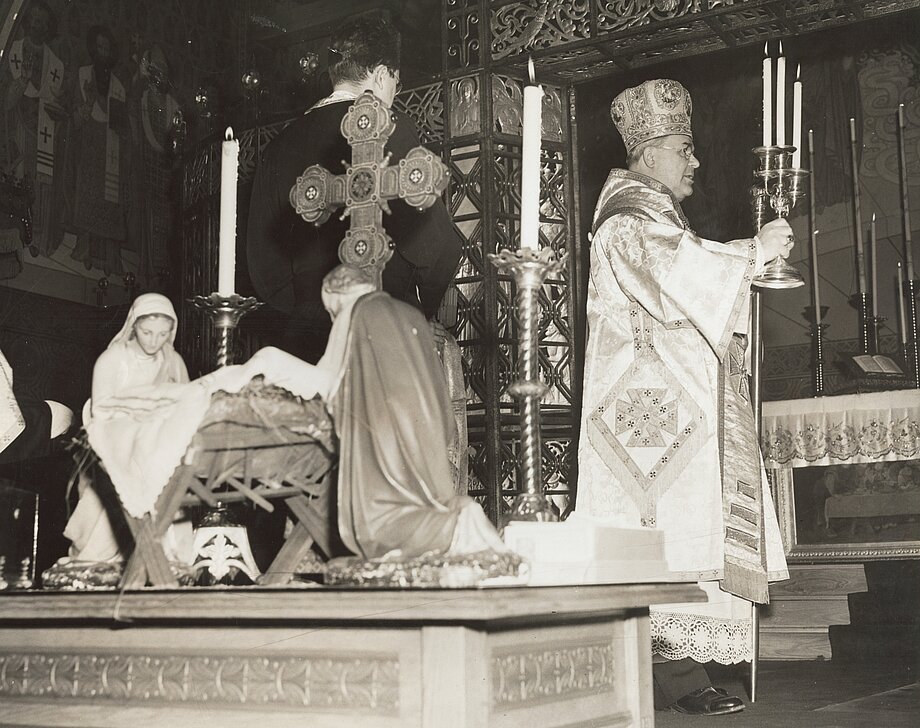 Bishop Constantine Bohachevsky incensing the iconostasis in the old cathedral during the Christmas service in January 1948.