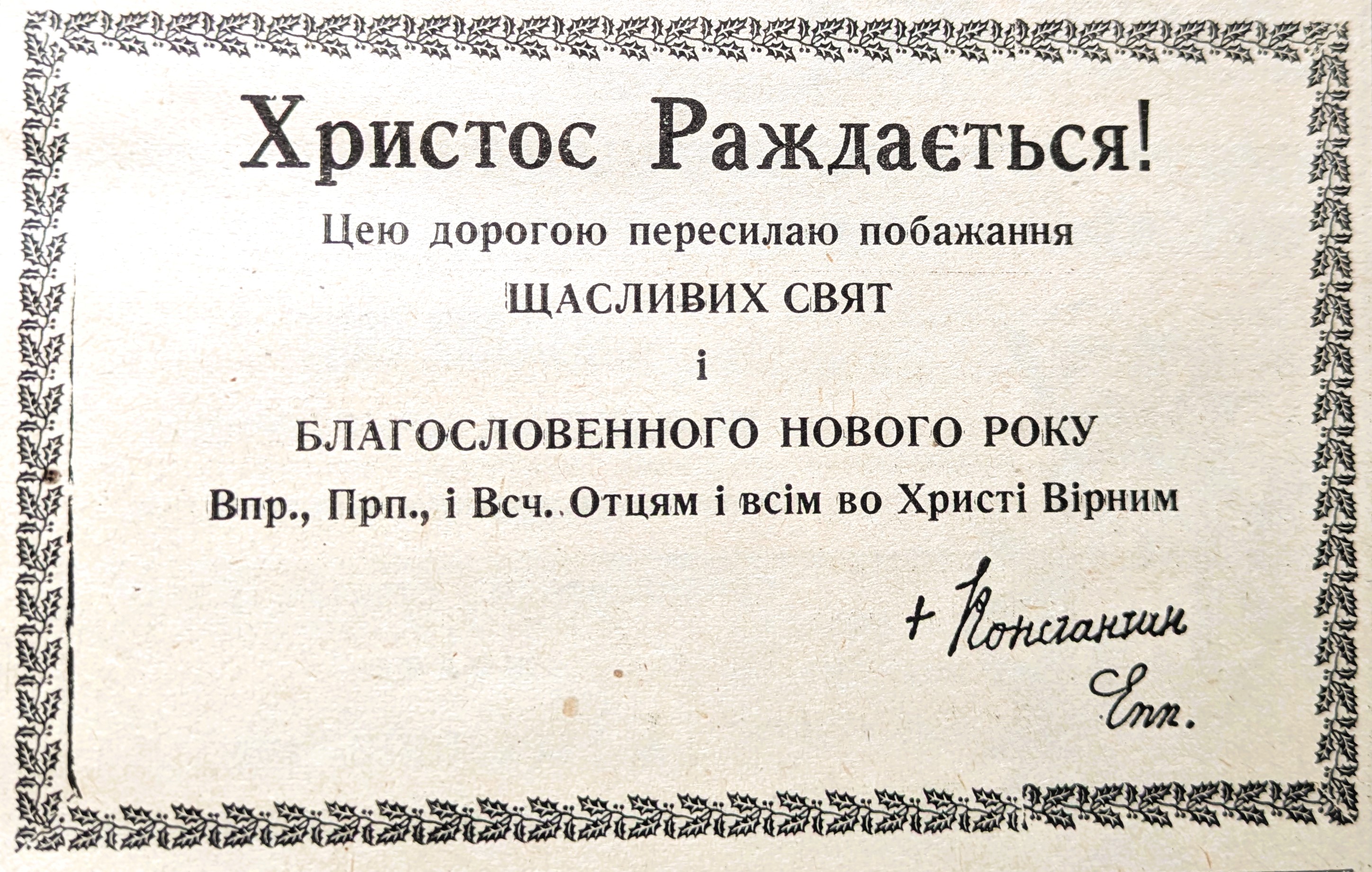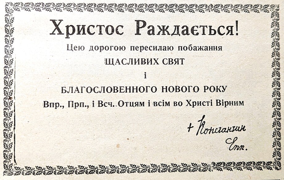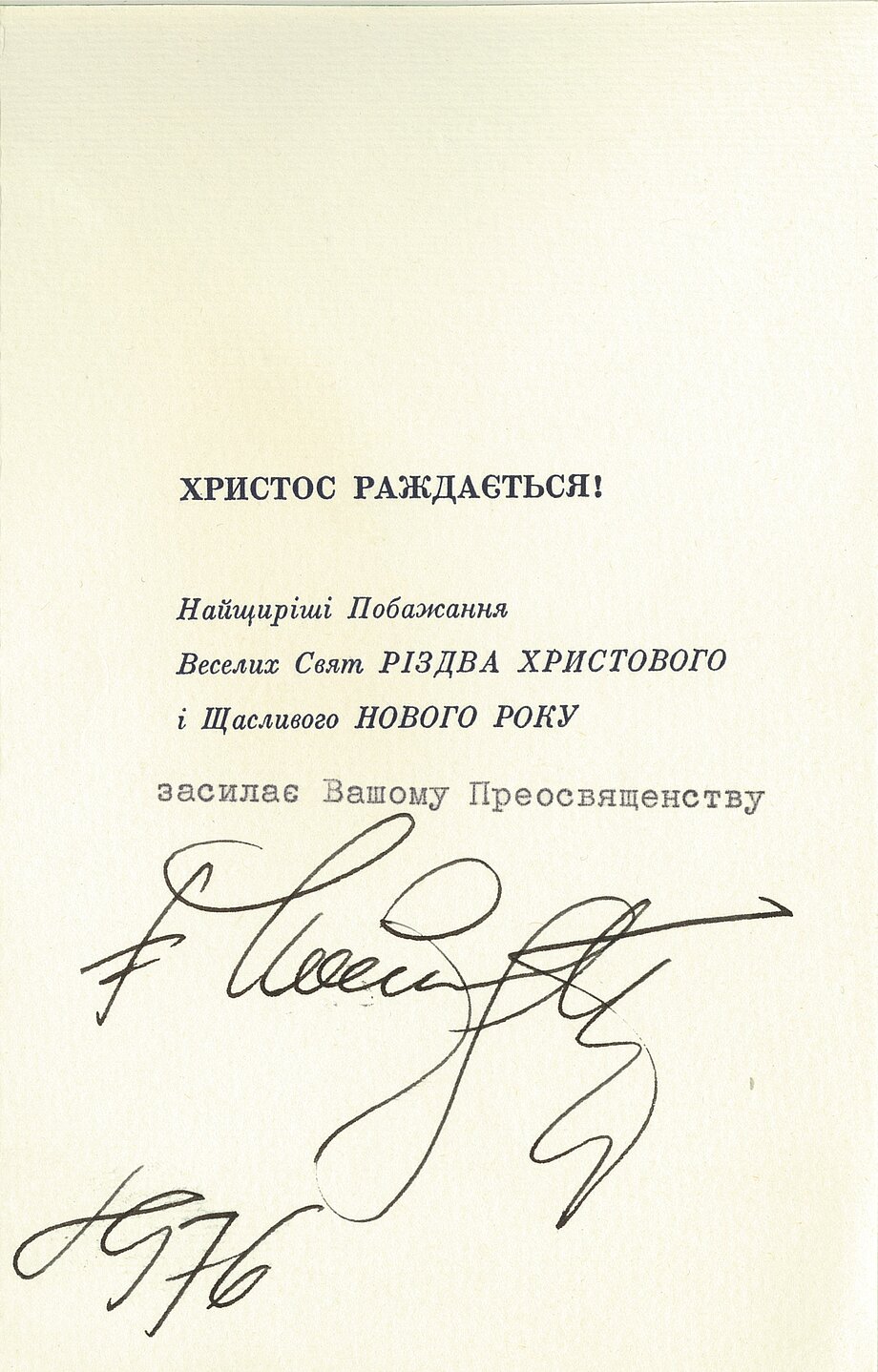 A heartfelt Christmas card from Patriarch Josyf Slipyj, signed and sent to Bishop Basil Losten in 1976.