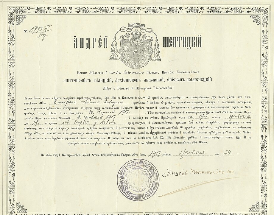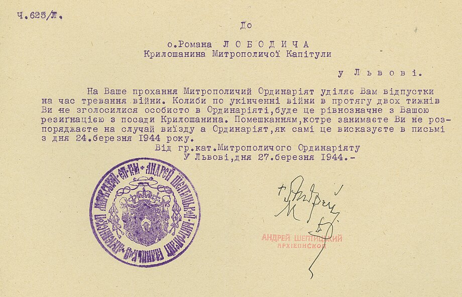 The first document signed by Metropolitan Andrey Sheptytsky for Father Roman was a decree of ordination, issued on October 24, 1917. Bishop Andrey had only recently returned from Russian captivity in September of that year and quickly resumed conferring the sacrament of priesthood to those who awaited ordination during his absence. By signing this decree, Metropolitan Andrey blessed Fr. Roman’s service, trusting him in his work as a priest. From 1917 to 1944, Fr. Roman remained loyal to the Metropolitan and his Church across various roles. He served as a chaplain during World War I and was captured on the Italian front. Later, he became a catechist and inspector of religious education for schools in the Stanislav eparchy. He ministered as a pastor in Zalukva near Halych, at the Cathedral of the Resurrection of Christ in Stanislaviv, and at the Cathedral of St. George in Lviv. He also headed the Biblios publishing house in Lviv, served as a member of the Polish Sejm, and was a chaplain in the Halychyna division. Clearly, Father Roman was deeply trusted by the Metropolitan, fulfilling his ministry in a multitude of ways.