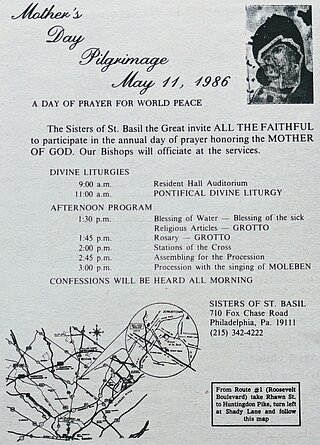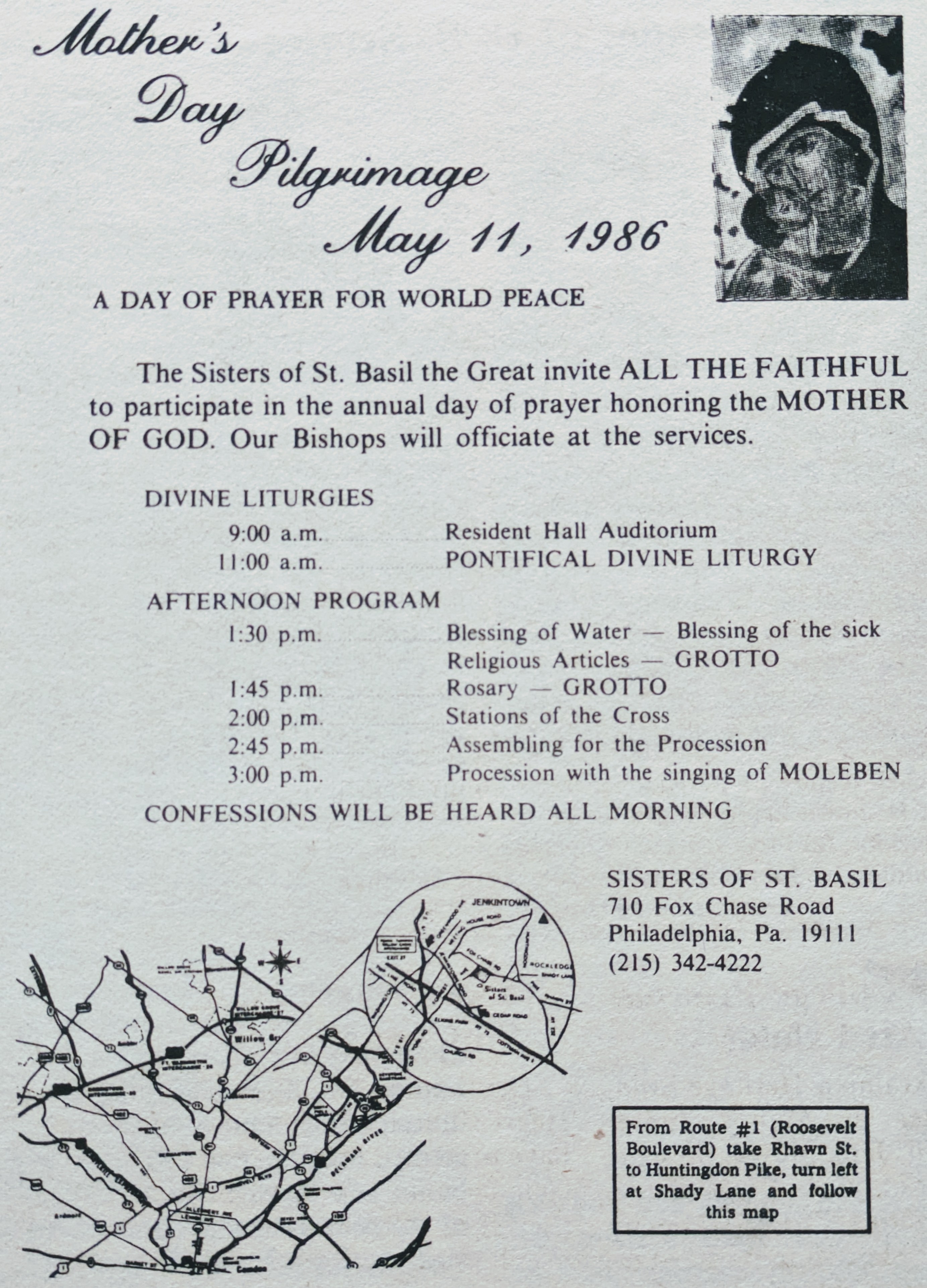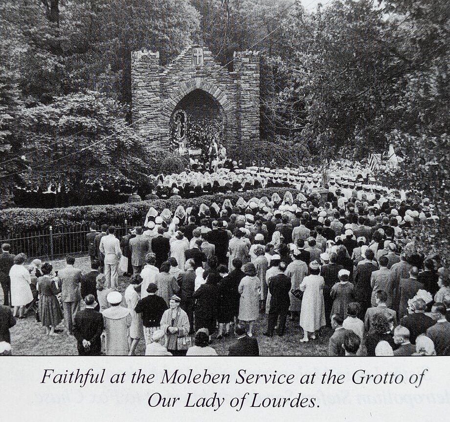 In the early 1930s, the sisters petitioned the Vatican and were granted permission to hold the pilgrimage at their motherhouse in Fox Chase, near the Grotto of Our Lady of Lourdes. Since then, they have planned and held it annually, gathering hundreds of pilgrims in prayer. Often, these pilgrimages were led by Philadelphia’s metropolitans and bishops of other Ukrainian Catholic eparchies in America. The sisters also invited many priests of the archeparchy to hear confessions, prepare solemn sermons in two languages, and lead the faithful in the prayer of the rosary, the Stations of the Cross, and Molebens, which were often part of the pilgrimage.