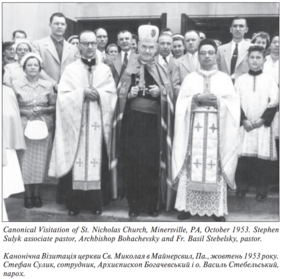 Subsequently, he was appointed as an assistant pastor at Holy Spirit Parish in Brooklyn, NY, serving under Fr. Volodymyr Andrushkiv from September 1952 to April 1953. He then served as an assistant pastor under Fr. Vasyl Stebelsky in Minersville, PA, from April to November 1953, and under Fr. Lev Adamiak in the parish of the Holy Trinity in Youngstown, OH, from December 1953 to January 1955. For one year, from January 1955 to January 1956, he served as pastor of Saints Peter and Paul Parish in Phoenixville, PA. In November 1955, he began working in the episcopal chancery in Philadelphia. In that same month, Fr. Stepan became the first missionary to Houston, TX, where he spent a month organizing the first parish in that state.