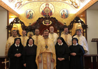 Of Irish descent, Mother Maria grew up in the Roman Catholic tradition. Sensing a call to monastic life, she began researching various communities and discovered the Byzantine rite, which captivated her. Drawn to its liturgical tradition, she learned about the Missionary Sisters’ monastery in Stamford and attended a silent retreat there. Feeling a strong connection to the community, she later worked for six years as a social worker with the elderly in Chicago before leaving everything behind to join the Missionary Sisters in 1997. Entering the monastery at age 33, she is considered a “late vocation.” Mother Maria currently serves as superior of the Missionary Sisters of the Mother of God monastery in Philadelphia.