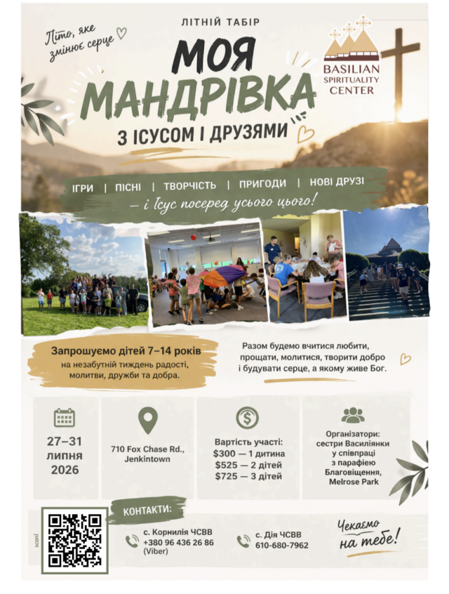 Сестри Василіянки у співпраці з парафією Благовіщення в Melrose Park запрошують дітей віком 7–14 років до участі в літньому таборі, який відбудеться 27–31 липня 2026 року у Василіянському духовному центрі (710 Fox Chase Rd., Jenkintown, PA).