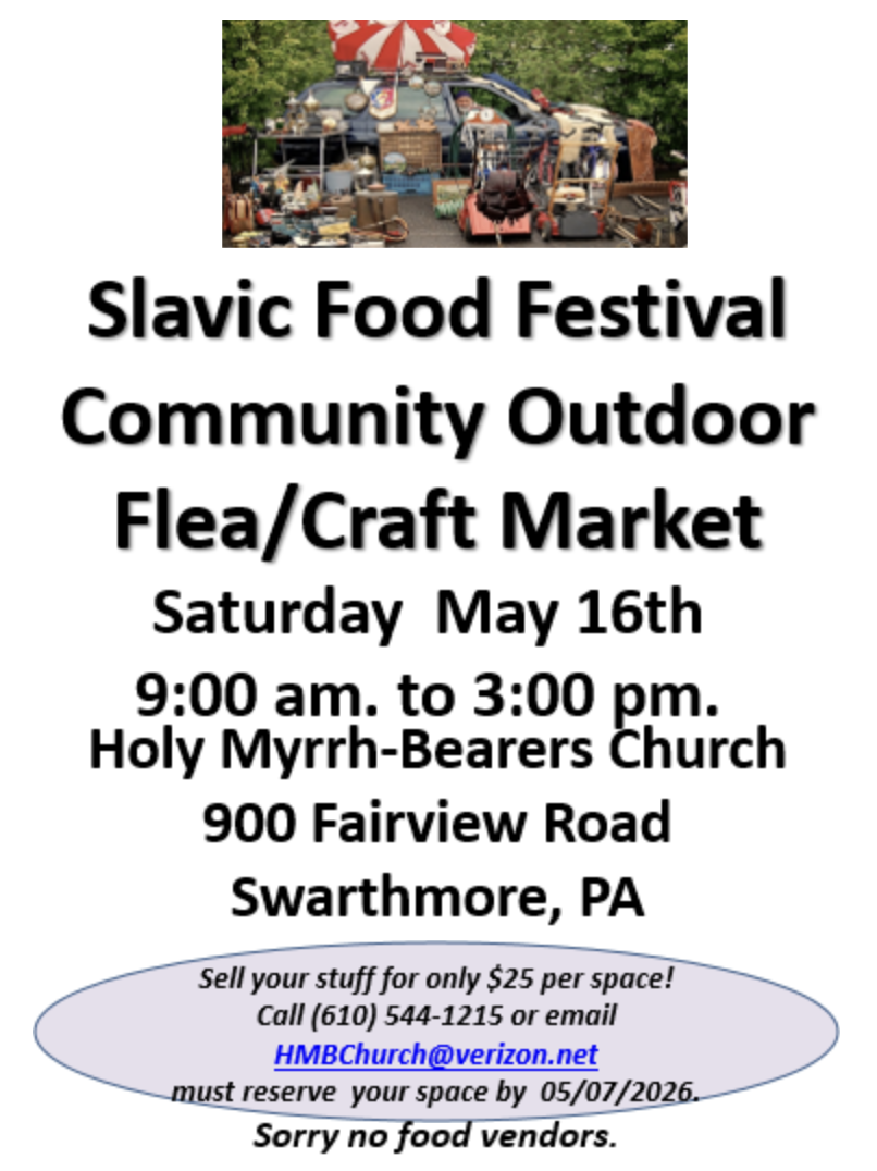 Now is a good time to begin planning to get that “extra stuff” out of your living area. To help you, everyone is invited to Holy Myrrh-Bearers Church, 900 Fairview Road, in Swarthmore (Ridley Township) to a Slavic Food Festival and Community-wide Outdoor Flea Market/Craft Fair on Saturday May 16th from 9:00 am. thru 3:00 pm. with a no rain date. Spaces will be approximately 10' x 16' (1 car spaces) and you may set up your tables beginning at 7:30 to 8:00 am. Vehicles may be parked next door at Notre Dame's parking lot. A check for $25.00 per space is required by May 7th to secure your non-food vendor space. Checks may be made payable and sent to or dropped off at: