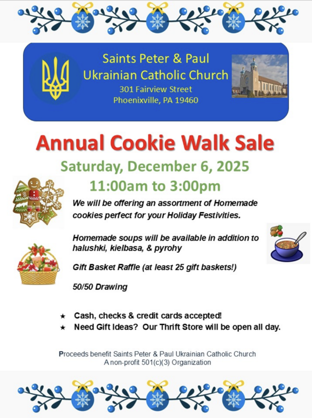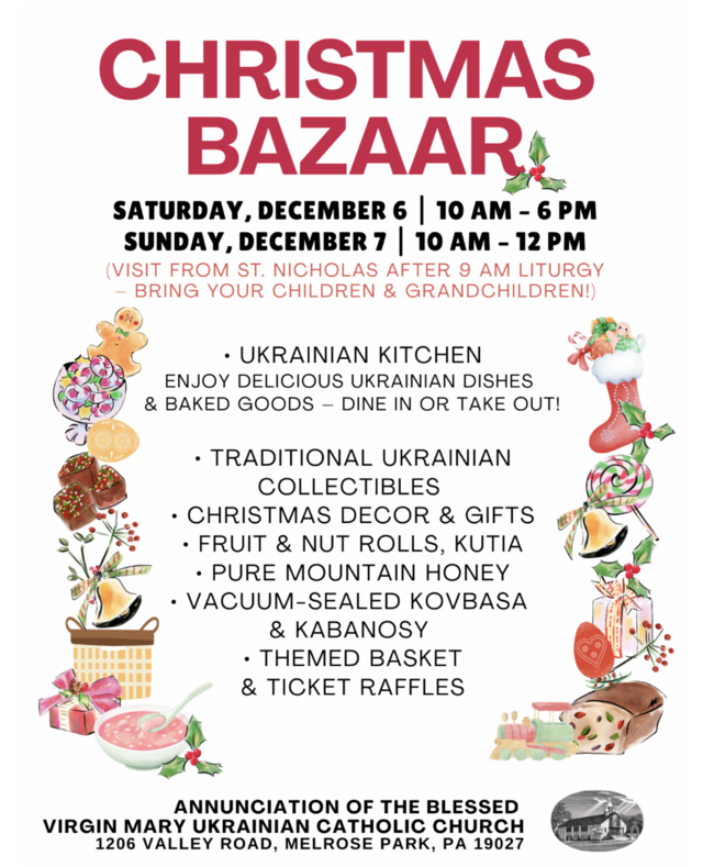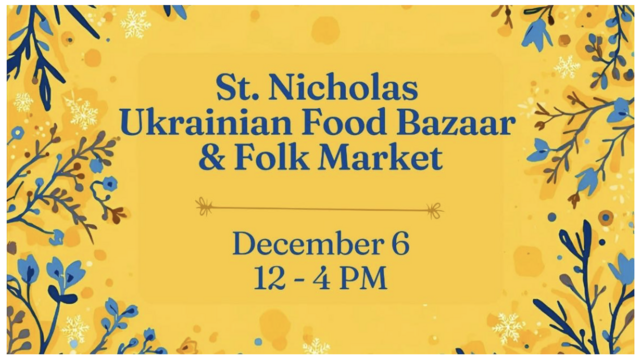 Join us on Saturday, December 6, 2025, from 12:00 to 4:00 PM at 24th & Poplar Streets, Philadelphia, PA 19130 for the St. Nicholas Ukrainian Food Bazaar & Folk Market, where we’ll be serving a variety of homemade favorites — potato and blueberry varenyky, borshch, holubtsi, bigos, pastries, and more.