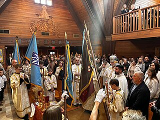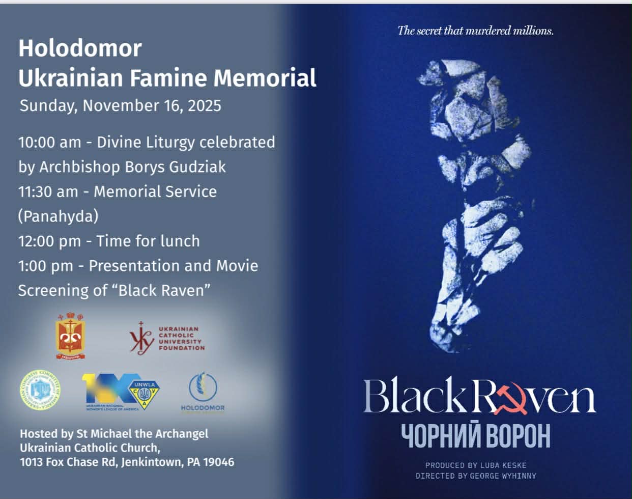 On November 16, St. Michael’s Ukrainian Catholic Parish in Jenkintown, PA hosted a screening of the film Black Raven by Luba Keske. Metropolitan Borys Gudziak presided at the Sunday Divine Liturgy and a Panakhyda for the victims of the Holodomor. The film features haunting testimonies of eyewitnesses and survivors of the 1932–1933 Holodomor genocide. Filming took place in 2008. The project reflects 17 years of perseverance through numerous obstacles and setbacks. After a series of legal battles, Ms. Keske secured the right to use recorded interviews with individuals who are no longer alive, and together with young director George Wyhinny completed the film.