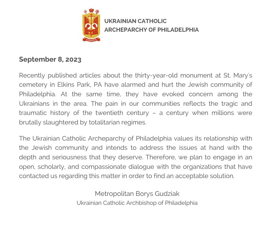 The Ukrainian Catholic Archeparchy of Philadelphia values its relationship with the Jewish community and intends to address the issues at hand with the depth and seriousness that they deserve. Therefore, we plan to engage in an open, scholarly, and compassionate dialogue with the organizations that have contacted us regarding this matter in order to find an acceptable solution.