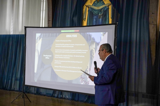 George Mykytyn, Chief Financial Officer, presented on the stewardship and development of the Archeparchy’s temporal resources. He highlighted the establishment of the Development Office and reported growth in donor engagement, with increased fundraising through annual appeals and grant initiatives.