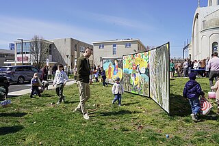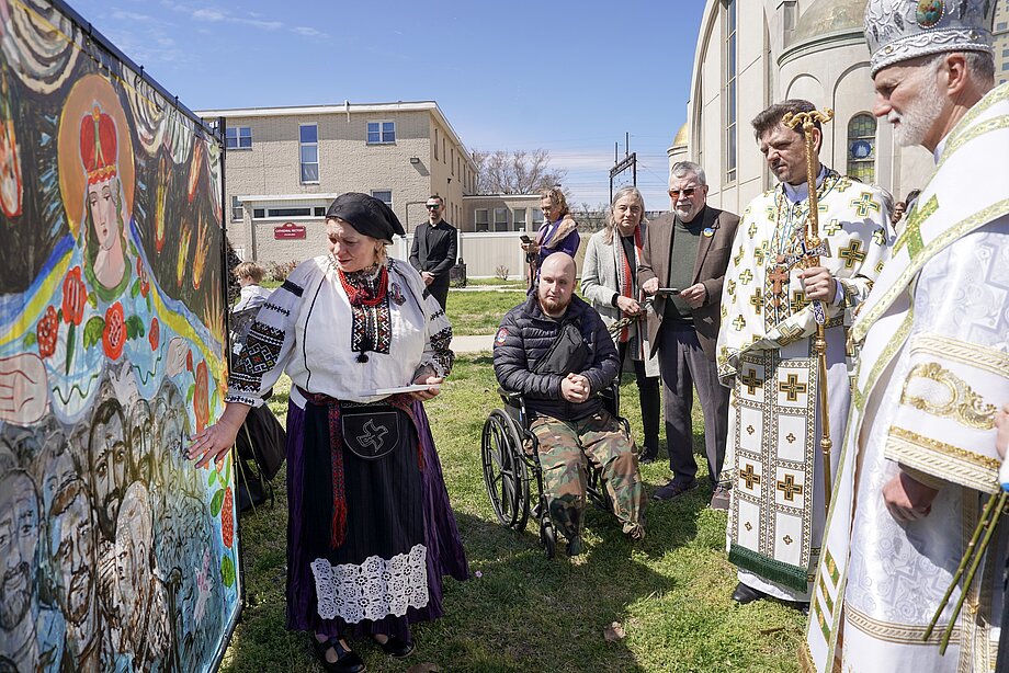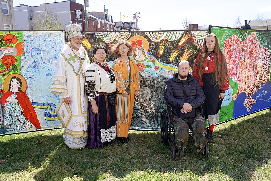 The project brought together professional artists, wounded Ukrainian soldiers receiving prosthetics and medical treatment in the United States, students of the Ukrainian School of Philadelphia, and members of the local Ukrainian community. During the opening, those gathered for the liturgy were also invited to contribute, leaving their own marks and signatures on the canvas.