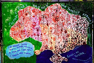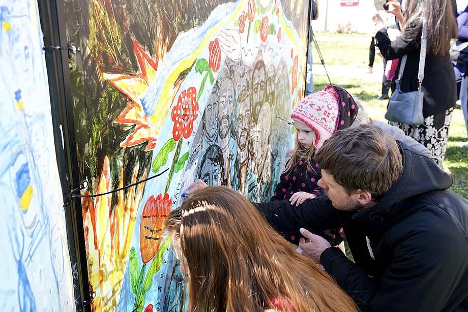 The painting was created by three Ukrainian artists: Tetyana Myalkovska, a mother who lost her son, soldier Mykola Myalkivsky, in the war against Russia; Tetiana Rusetska; and Iryna Semenenko. Through this collaborative work, participants expressed their experiences of war, trauma, and loss, while also seeking healing and hope.