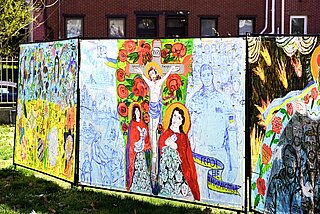 On March 29, following the solemn celebration of Palm Sunday at the Ukrainian Catholic Cathedral of the Immaculate Conception, Metropolitan Borys Gudziak officially unveiled the monumental art project “The Song of Songs of the Ukrainian People,” a 30-meter outdoor painting created collectively throughout March 2026.