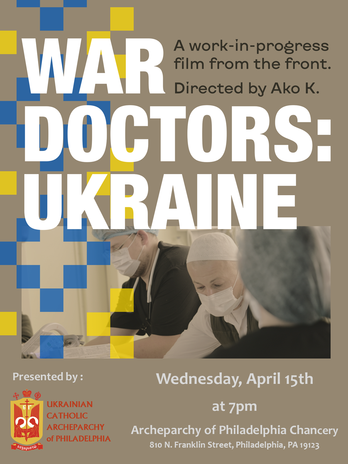 The Ukrainian Catholic Archeparchy of Philadelphia proudly presents a screening of the work-in-progress film War Doctors: Ukraine. Through unprecedented access, director Ako K. provides us with a glimpse at the raw and all too often painful reality of frontline surgeons and medics.